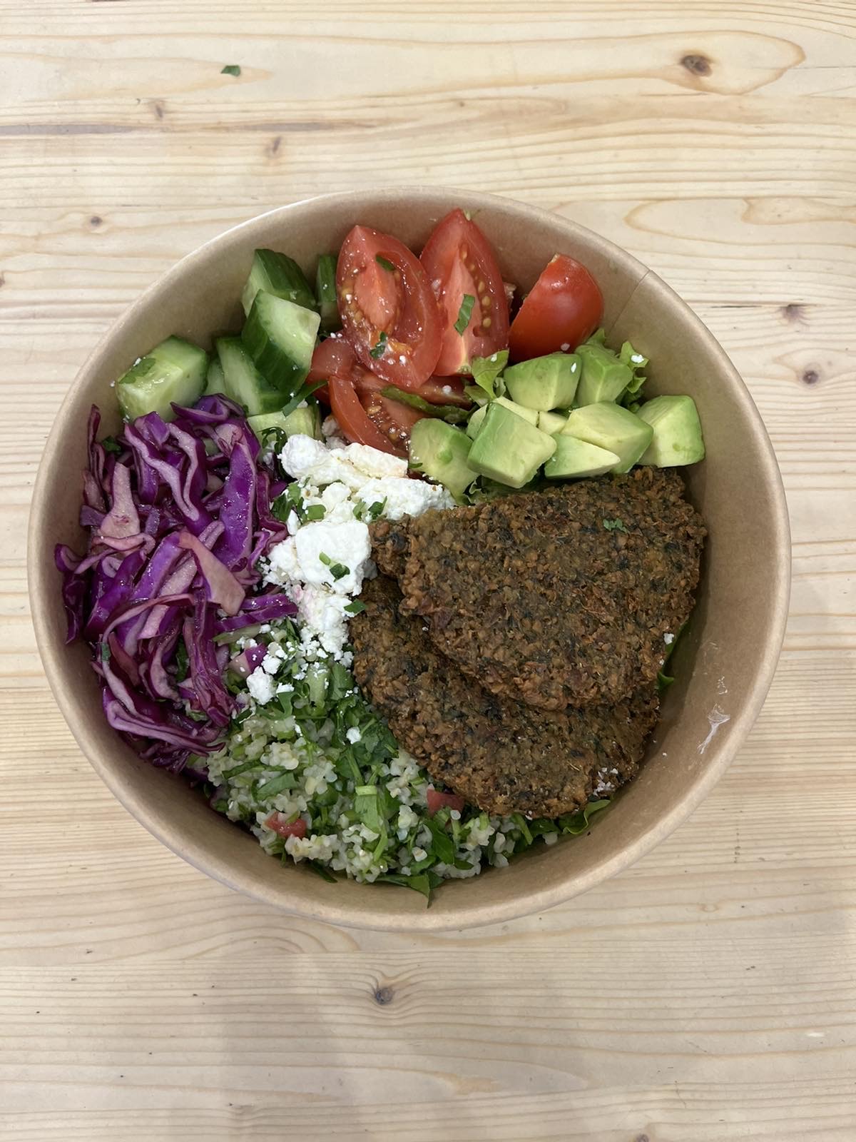 Съставки: Зелени салати, табуле, червено зеле, чери домат, краставица, сирене, тахини, дресинг с нар